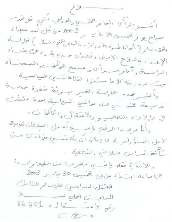 COMUNICADO: Comunico a la opinión pública local e internacional, que el jueves 30 de enero de 2003, he sido agredido por un preso de derecho común provisto de arma blanca y una barra de hierro (que además es uno de los cabecillas del tráfico de drogas en la cárcel de Salé). Dicha agresión ha tenido lugar en el propio patio de la institución carcelaria y a vistas y oídas de los presos y de los funcionarios de la prisión, acto que fue acompañado de expresiones proferidas por el malhechor en cuestión, con el objeto de provocarme contrariando mis convicciones políticas. Considero este intento, de ningún modo inocente, como un nuevo paso viejo y conocido para doblegarme y hacerme desistir de mi postura política, después de fracasar todos los intentos de emigración forzada, encarcelamiento y enjuiciamientos. Ante esta situación, responsabilizo total y exclusivamente a las autoridades marroquíes de todo lo que pueda ocurrirme y amenace mi integridad física. A título informativo, comunico que desde el jueves 30 de enero de 2003 estaré en huelga de hambre durante 48 horas. Preso